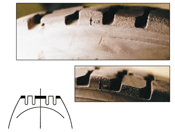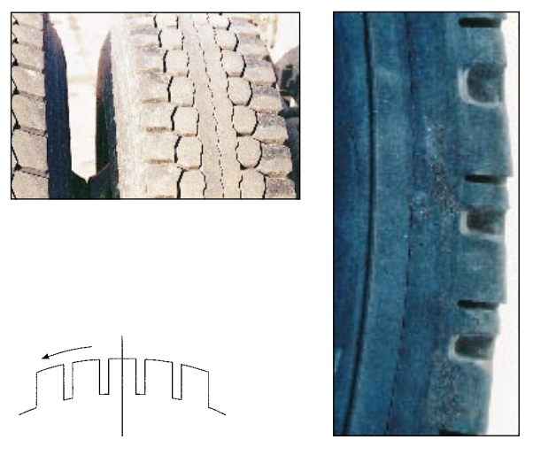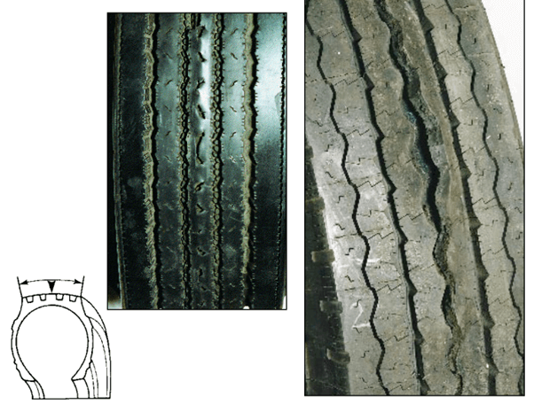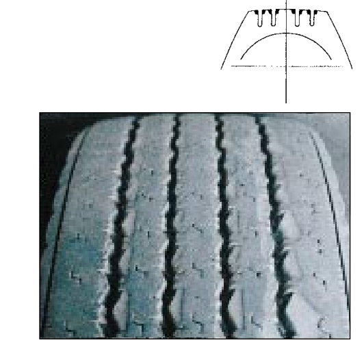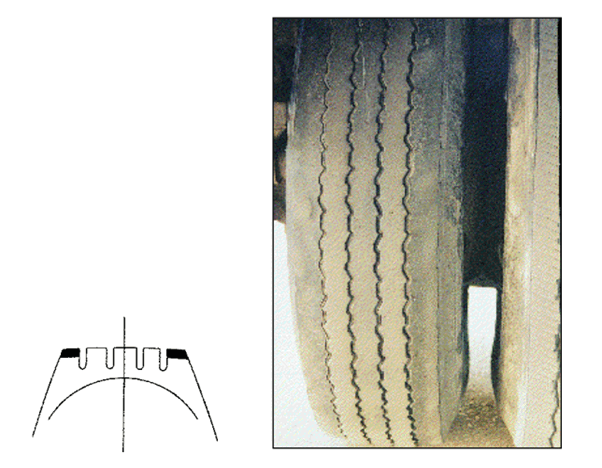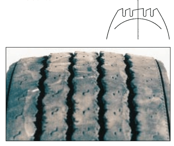 This is erratic dips or depressions appearing around the edge of the tread caused by excessive tyre bouncing or wobbling.