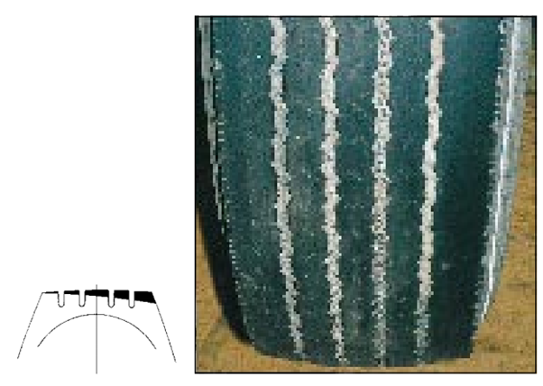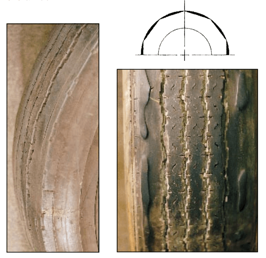 Circumferential wear along rim edges as a result of slow wear rate of radial tyres on free rolling axles.
